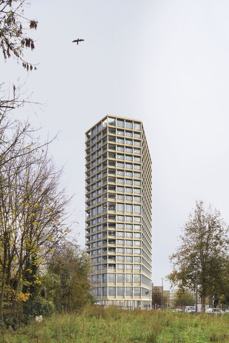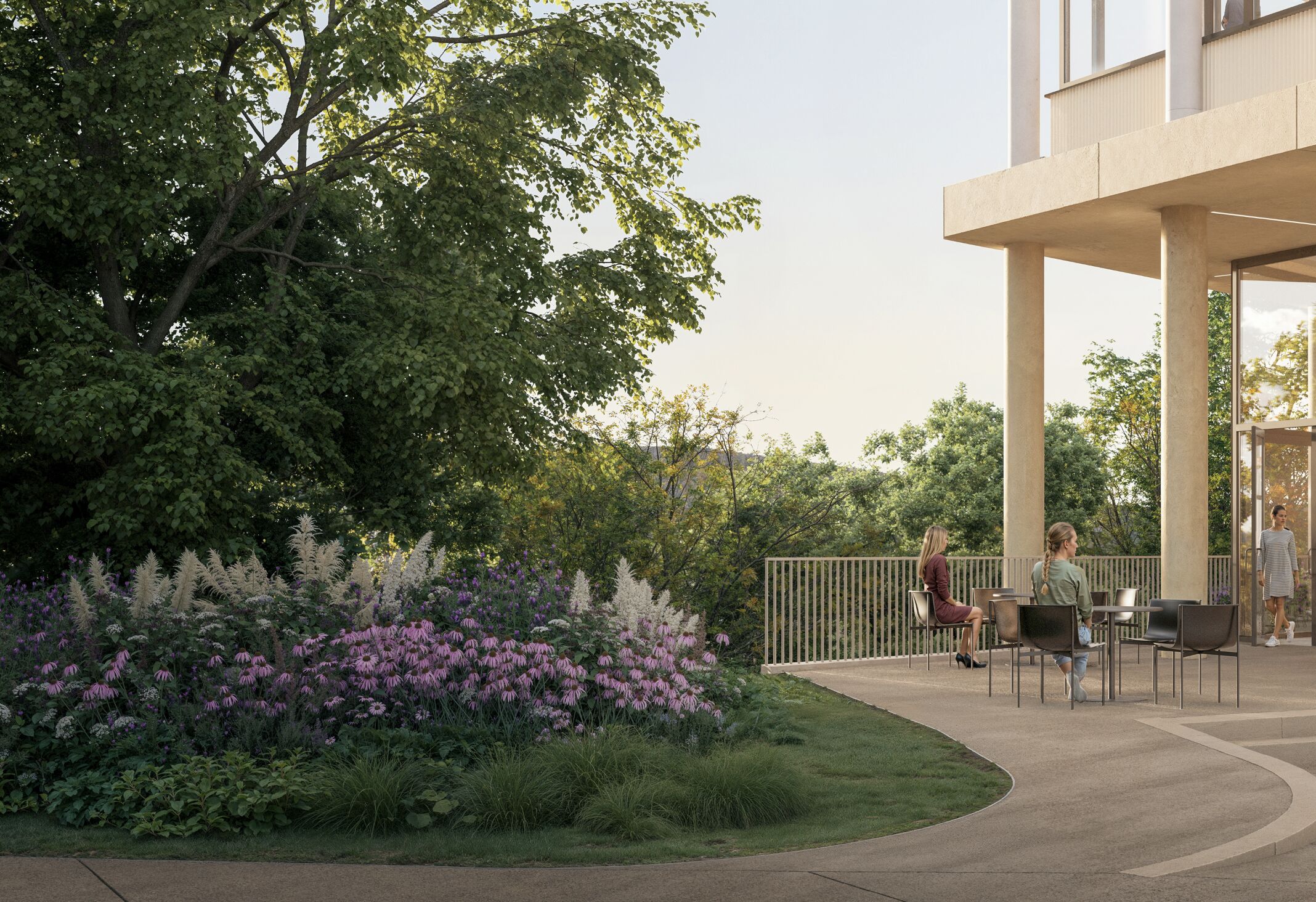 Le projet intègre des terrasses végétalisées sur les niveaux supérieurs (+2 et +10) afin de favoriser la biodiversité en hauteur, tout en s’harmonisant avec les espaces naturels environnants. Différents types de toitures vertes et terrasses accessibles sont conçus pour maximiser la rétention d’eau de pluie et minimiser les charges structurelles, tout en respectant les normes d’accessibilité et de sécurité incendie. La sélection des plantes met l’accent sur la biodiversité locale, marquant les saisons et limitant l’entretien. Une gestion intégrée des eaux pluviales et des espèces indigènes adaptées au climat est également mise en œuvre pour garantir la durabilité écologique du site.